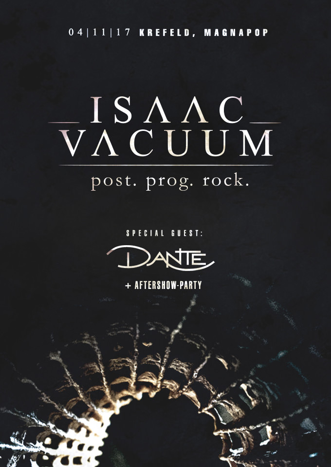 ISAAC VACUUM live + Aftershowparty November 4, 2017 Krefeld, Germany special guest DANTE Gig Details Time 8:00 PM Tickets VVK 10 € / AK 13 € BUY A TICKET Subscribe iCal Google Venue Details Address MagnapopDießemer Str. 24 Krefeld 47799 Germany Phone 01573 5286763